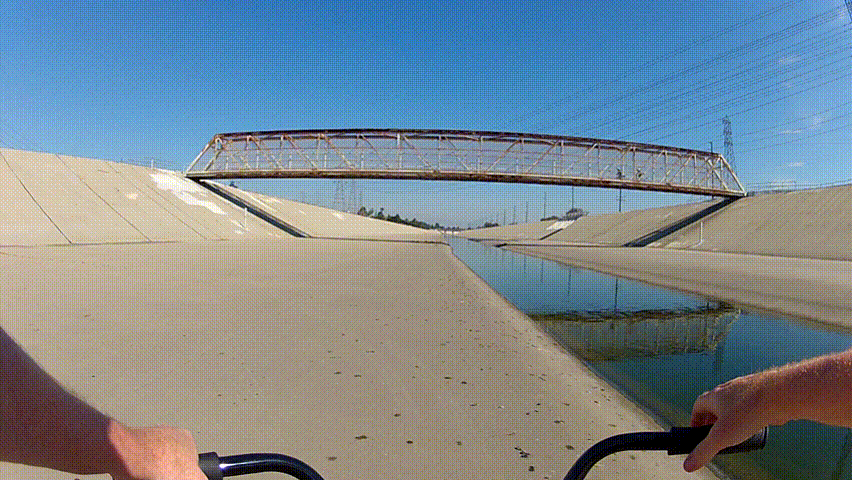 LONG BEACH, CA - February 23, 2013: The POV of someone riding a bicycle under a bridge in the San Gabriel River basin channel circa 2013 in Long Beach. Long Beach promotes bike riding and exercise.