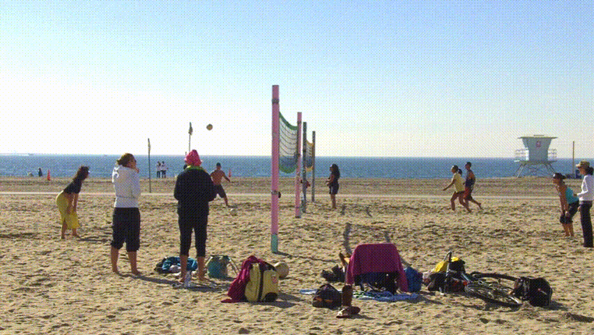 LONG BEACH, CA - February 23, 2013: A medium shot of young people playing a game of volleyball at the beach circa 2013 in Long Beach.