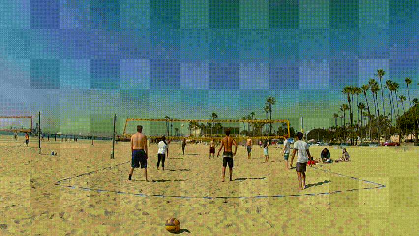 LONG BEACH, CA - February 23, 2013: A wide shot of young men enjoying a game of volleyball at the beach circa 2013 in Long Beach.