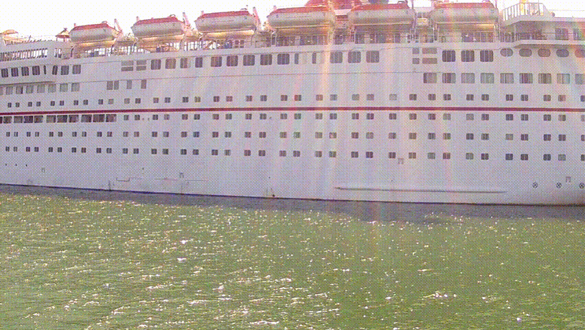 LONG BEACH, CA: May 25, 2013- The point of view of a camera on a boat moving past a huge cruise ship in port circa 2013 in Long Beach. Ocean tourism is big business in this coastal city.
