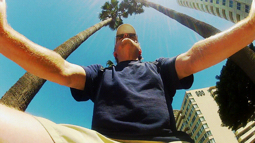 A low angle shot of an older, middle aged or mature man keeping active and fit by riding a bicycle in a downtown business district under tall palm trees and skyscraper office and apartment buildings.