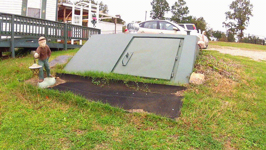 A man looks around as he slowly exits from a storm or tornado shelter on a cloudy day in Oklahoma.
