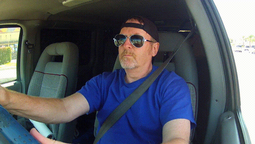 A medium shot of a middle aged man driving a delivery van on the streets of Los Angeles.