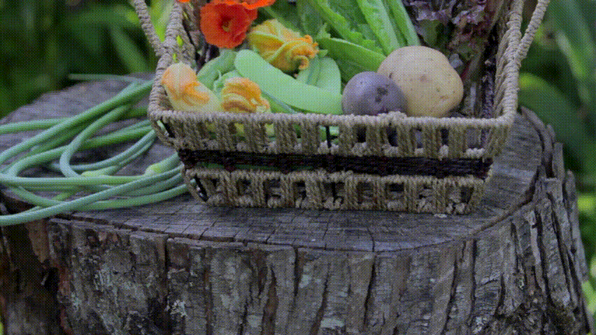 Pan up to basket of harvested vegetables