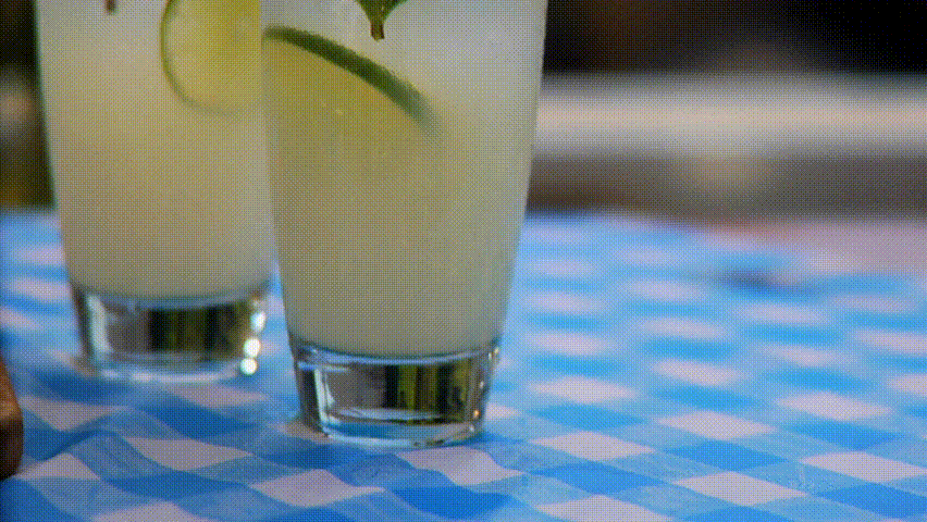 Pan over pitcher of limeade and glasses outside