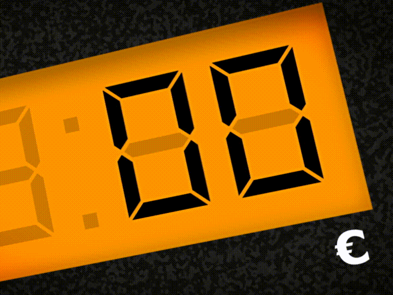 Petrol Pump, PAL. A petrol pump display showing high cost of fuel in Litres/Euro. Standard definition widescreen computer graphic.