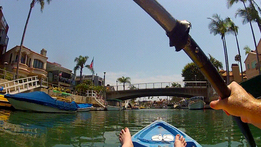The point of view of someone paddling a kayak in the Naples Island canals which are adjacent to Alamitos Bay in Long Beach, CA. The kayak is passing various boats as it approaches a bridge.