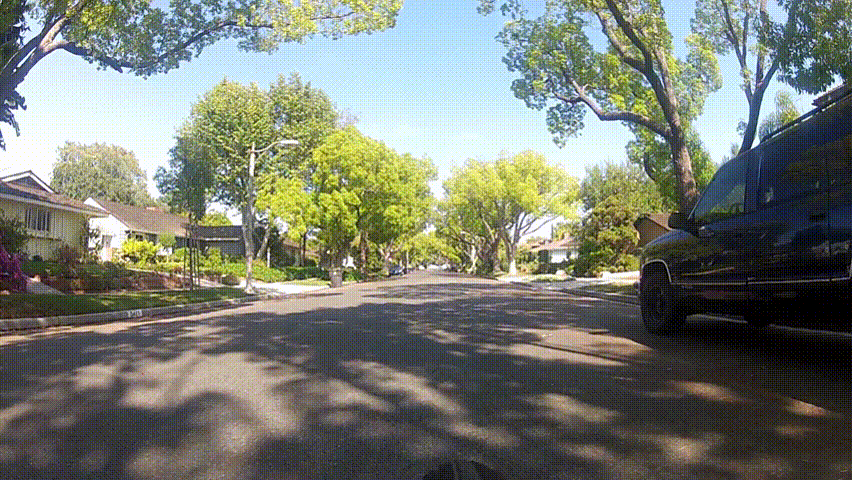 The point of view of someone riding a bicycle down the middle of a suburban street on a sunny spring day in California with nice homes and lots of leafy trees.