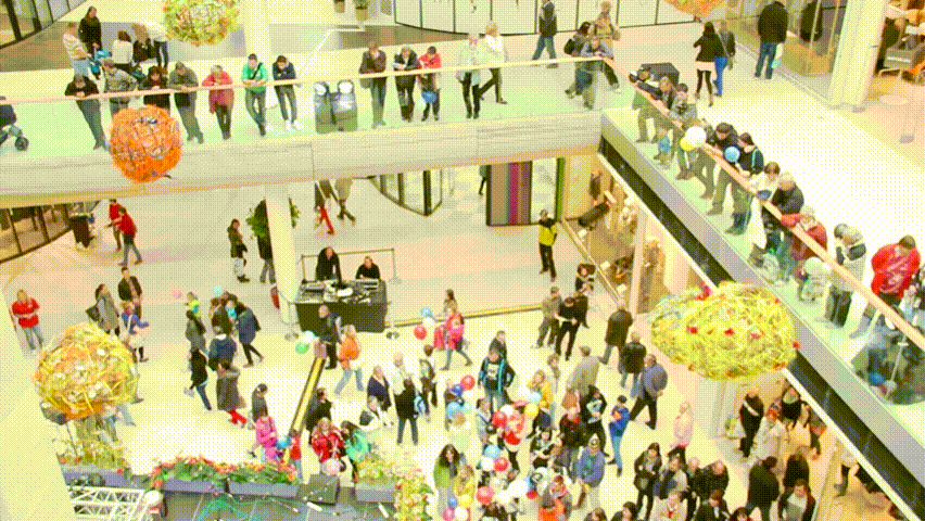 Slightly defocused crowd of walking people in the newly opened shopping mall center