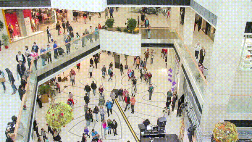 Slightly defocused crowd of walking people in the newly opened shopping mall center