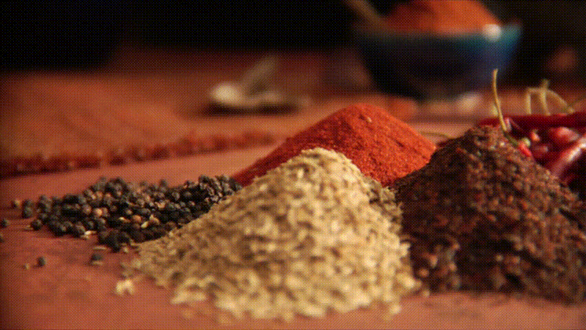 slow pan over peppers and a mountain of mexican spices