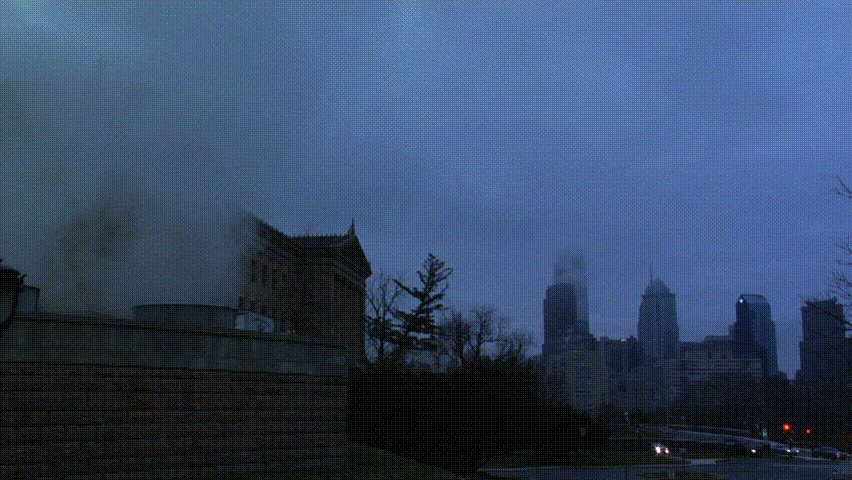 Steam from an industrial building on left side of frame. Overcast city of Philadelphia in the background.