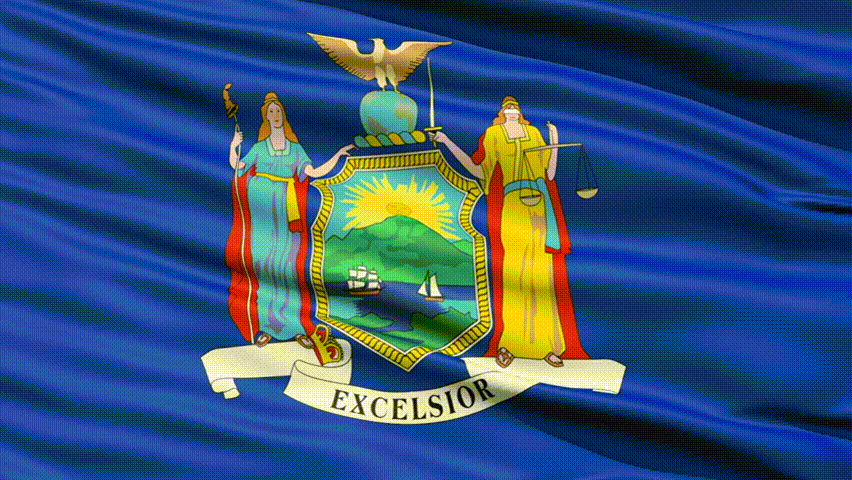 Waving Flag Of The US State of New York with the official coat of arms and two supporters.