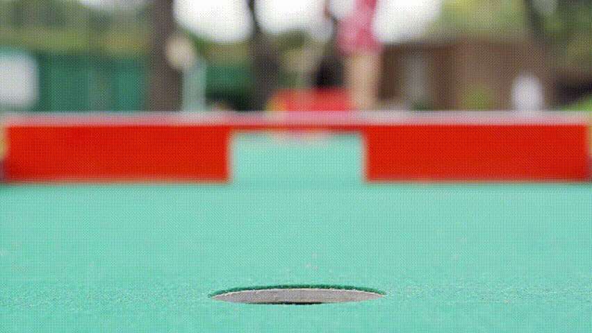 Young woman playing mini-golf during cloudy day, selective focus, successful attempt