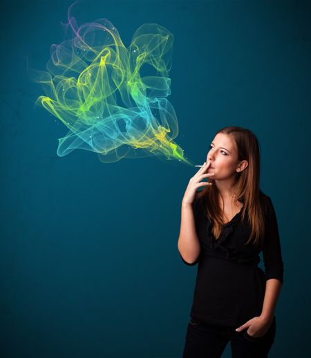 Pretty young lady smoking cigarette with colorful smokeImage used under license from Freestock.com<a href="https://www.freestock.com/free-photos/pretty-young-lady-smoking-cigarette-colorful-121127737">Image used under license from Freestock.com</a>