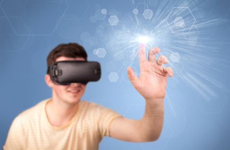 Young impressed man wearing virtual reality goggles with blue circles around his finger Image used under license from Freestock.com<a href="https://www.freestock.com/free-photos/young-impressed-man-wearing-virtual-reality-1104057248">Image used under license from Freestock.com</a>